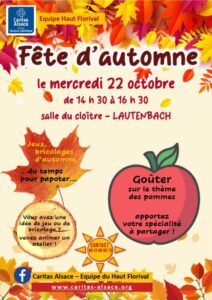 L’équipe Caritas Haut Florival vous propose une animation automnale le mercredi 22 octobre à Lautenbach de 14h30 à 16h30.