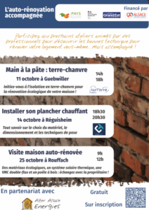Dans le cadre du programme de sensibilisation des habitants à l’Auto-Rénovation Accompagnée, pour apprendre à rénover soi-même son logement, le PETR du Pays Rhin Vignoble Grand Ballon et la Collectivité Européenne d’Alsace, en partenariat avec l’Association Alter Alsace Énergies, organisent une série de 3 nouveaux ateliers de formation pratiques et pédagogiques.